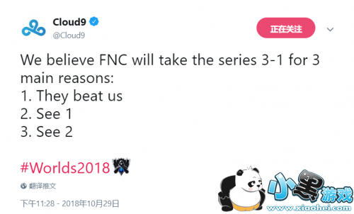 Cloud9官推助阵:FNC将会3:1IG获得冠军,S8总决赛将在FNC与IG之间进行,C9官推表示FNC将会3:1击败IG夺得冠军。