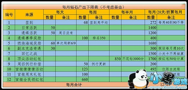 从表中我们可以看到,玩家A每月可以获得的钻石在12000左右。而且这里的计算都相对保守,实际产出一般还会比这个数字更高一些。