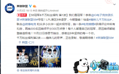 关注英雄联盟官方微博+转发微博即可参加英雄联盟电竞锦鲤。获得评论中所有礼物,再抽300名召唤师平分300万点券!11月22日感恩节抽出!