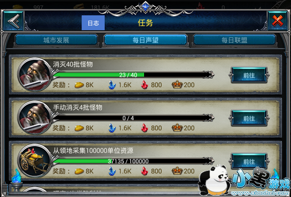 完成不同的任务都可以获得资源、声望、经验等多种奖励,帮助领主们快速成长。