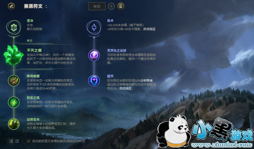符文方面,赛恩的符文以不灭之握为主,副系点出骸骨镀层、复苏之风、过度生长就可以了,过度生长配合W技能的生命值加成效果是非常明显的。副系带上巫术系,点出无效化法球以及超然,如果对面的菜刀队,法球可以换成焦灼,或是副系直接换成启迪系使用药王符文。