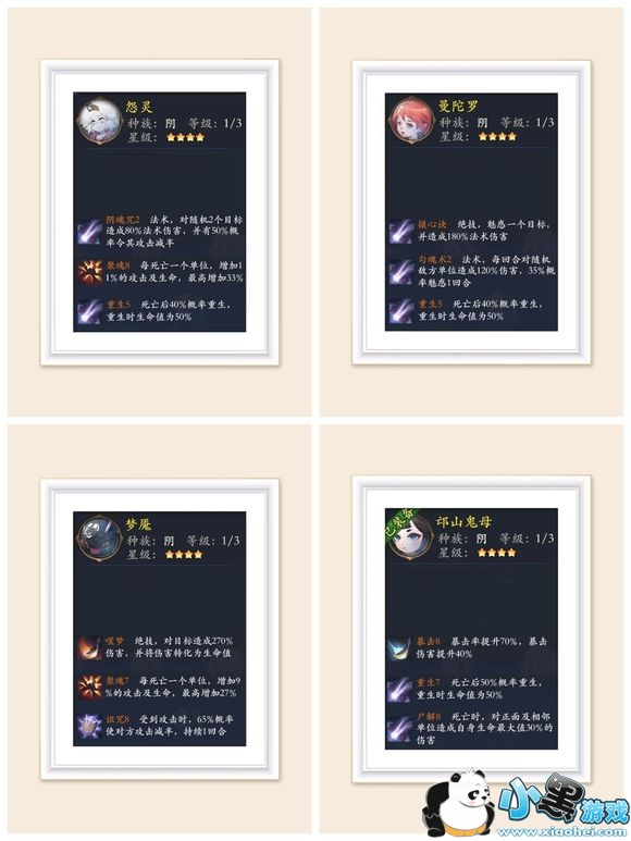 邙山鬼母:四星稀有,妖典合成,自爆流的核心,自身输出不算低,也不惧死,前期自爆伤害高得离谱,尤其是双鬼母自爆的时候,对面非残即死,除了中后期输出较为乏力,以及容易成为带嗜血妖灵养分外,没有特别明显缺点。