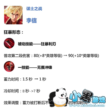 6、李信加强:提高被动技能出发的二段伤害,一技能蓄力时间减少,冷却时间变成7秒。
