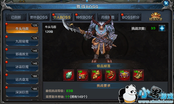 在游戏当中,每个玩家都拥有单挑强大BOSS的机会,点击激战BOSS图标,可以进入个人BOSS界面进行挑战。