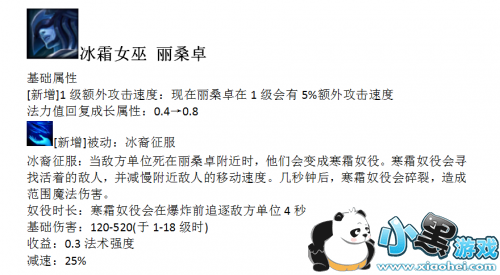 解析:首先我们就来看看8.23的小重做项目,丽桑卓的被动重做。被动技能改成了冰裔征服,无论丽桑卓是否接触到了敌人,只要敌人死在了丽桑卓附近,就会变成一具寒尸,四秒后发生爆炸,造成额外伤害并减速敌人,满级520的伤害,并且具有0.3的AP的AP加成。虽然这个技能在对线期几乎无法触发,触发了效果也没有多大用处,但在团战中,这个被动都会给敌人带来巨大的麻烦,敌人不仅要注意丽桑卓的技能,还需要注意自己的队友是否变成了冰尸,变成了冰尸就还得远离,一来二去,丽桑卓对敌人阵型的威胁就更大了。