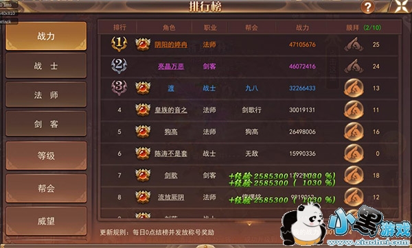 排行榜系统除了能让战力等级帮会威望等厉害的人上榜外第一名还会获得专属称号,仅有一天期限,每天都会重新给今日排行第一的人发放称号,除此之外,普通玩家也可以通过膜拜大神玩家来获得金币,每天最多可以膜拜10次。