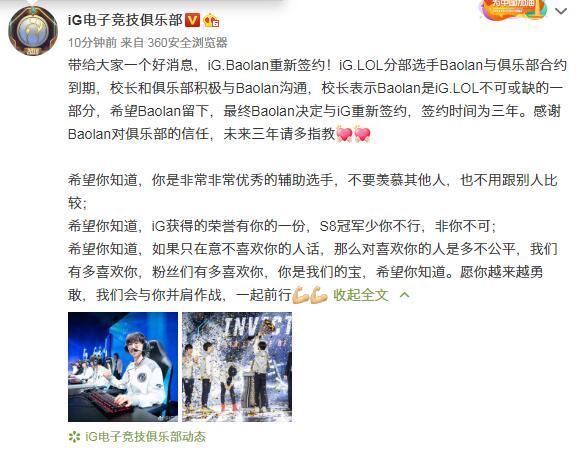 腾讯体育讯 北京时间11月30日,iG官博宣布辅助baolan在校长和俱乐部管理层的努力下已重新续约三年。昨日baolan通过微博透露或许不会与iG续约引发网友热议,“校长留住宝蓝吧”的词条还一度登上热搜。
