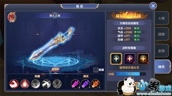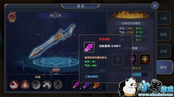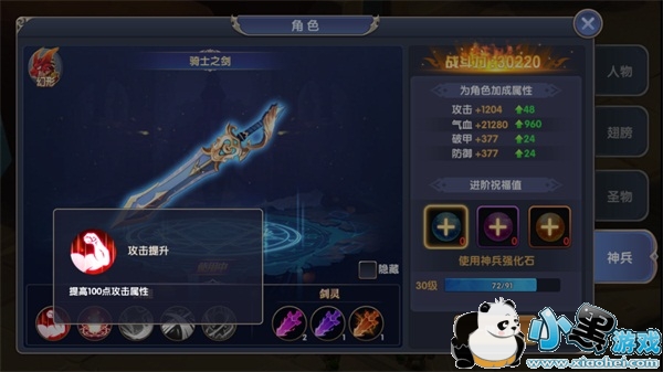 神兵可通过进阶来提升属性。消耗神兵强化石、中级神兵强化石和高级神兵强化石可进阶翅膀。