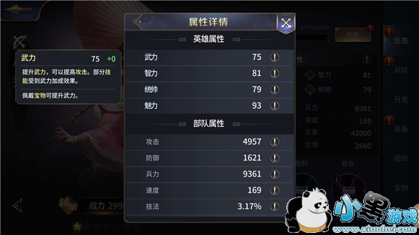武力:提升武力,可提高攻击。部分技能受到武力加成效果。(佩戴宝物可提升武力)