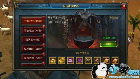 在60级世界地图内非安全区域免费召唤世界BOSS,击杀后,掉落大量高级装备和稀有材料。