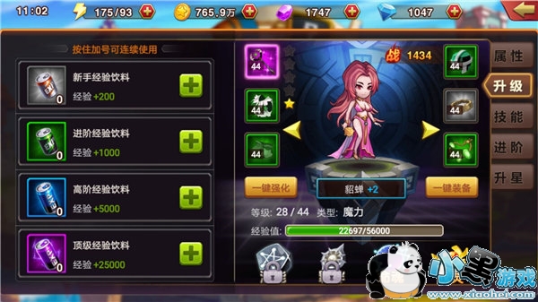 升级:消耗经验饮料升级,同一单位数量的不同饮料增加的经验值不同,可以通过购买或者通关获得饮料。