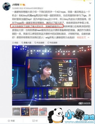 因为年龄比iboy还小半年,所以iboy先进去大家的视线,但对于hope我一直都非常非常期待。在这场比赛中他坚持争取上场,并且战胜了强大的对手,我真的超级开心!特别希望以后有更多的好的表现给大家!也特别感谢heart教练员在这次德杯准备期间的准备,真的作为俱乐部的一员,我是可以感受的到这次德杯中的试探和调动,才刚刚开始,会越来越好!感恩所有帮助支持我们的人!edg所有人请继续努力去挑战!