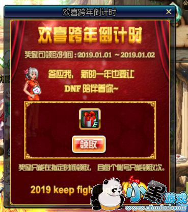 这个活动的领取时间为2019.1.1~2019.1.2。也就是到新的一年新的开始,也是DNF准备的新年开年礼包。