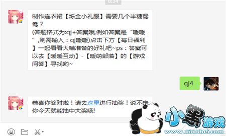 制作连衣裙【烁金小礼服】需要几个半糖鸳鸯?奇迹暖暖微信公众号每日一题答题玩法每天都会进行不同的题目考验玩家对游戏的熟悉程度,回答正确的答案后能获得游戏给玩家提供的大量奖励,今天的答案在游戏中可以发现。