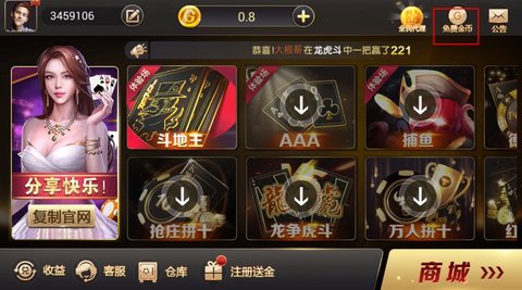 玩家登录游戏,点击游戏页面右上角“免费金币”,点击“免费金币”。