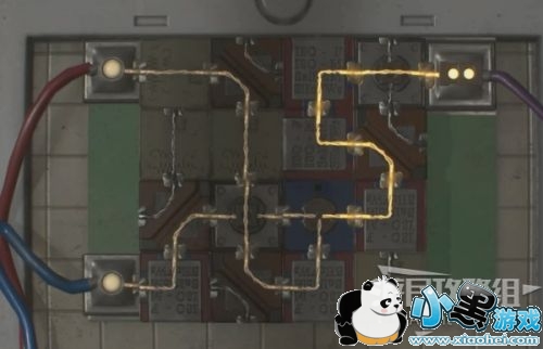 解谜思路是,左边两个黄色点的电力,都要接到右边紫色线上去。那么,两条线必在某处汇到一起,然后最终通往紫色线。那么紫色线这边的路线是可以确定的。