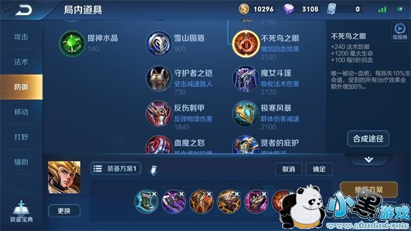 韧性鞋,暗影战斧,暴烈之甲,红莲斗篷。后续的装备可以从不死鸟,不详征兆,魔女斗篷和反伤刺甲中选择。来提供更高的抗性和生命值。