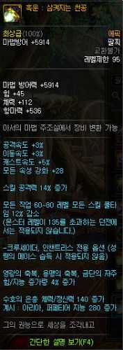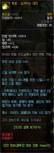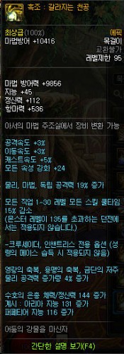 | 所有属性强化 +34 技能攻击力 +16% -圣骑士、咒术师专属属性(学习圣灵权杖时无效) [荣誉祝福]、[勇气祝福]、[禁断的诅咒]力量和智力增加量 +4% 守护恩赐]体力、精神 +216 [启示 : 圣歌]、[人偶操纵者]智力 +136 | 所有属性强化 +34 技能攻击力 +10% 所有职业 Lv80~85 全部 技能 Lv +1(特性技能除外) -圣骑士、咒术师专属属性(学习圣灵权杖时无效) [荣誉祝福]、[勇气祝福]、[禁断的诅咒]力量和智力增加量 +4% 守护恩赐]体力、精神 +155 [启示 : 圣歌]、[人偶操纵者]智力 +126 | 攻击速度 +3% 移动速度 +3% 施放速度 +5% 所有属性强化 +34 技能攻击力 +11% 所有职业 Lv35~45 全部 技能 冷却时间 -15% (怪物等级超过135级属性无效) -圣骑士、咒术师专属属性(学习圣灵权杖时无效) [荣誉祝福]、[勇气祝福]、[禁断的诅咒]力量和智力增加量 +4% 守护恩赐]体力、精神 +196 [启示 : 圣歌]智力 +101 [人偶操纵者]智力 +116 |