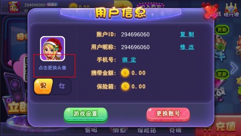 1、在游戏主页面点击自己的头像图标,进入“用户信息”弹窗页面。