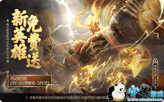 小妲己为召唤师带来了一个好消息!2月19日更新后起累计登录游戏收集盘古碎片,集齐盘古碎片*20可兑换永久英雄-盘古,每天还可领取盘古英雄体验卡抢先体验全新英雄哦!