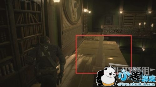 通过交谊厅来到二楼图书室,使用千斤顶把手放下书柜。