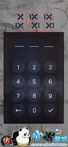 最后攻略售货机,这个密码看似摸不到头脑,其实是需要你去补齐没有画出来的线,写出来是类似计算器的数字,图中红笔描出密码为922计算器的数字,黑杠的地方不看,只看空白的地方