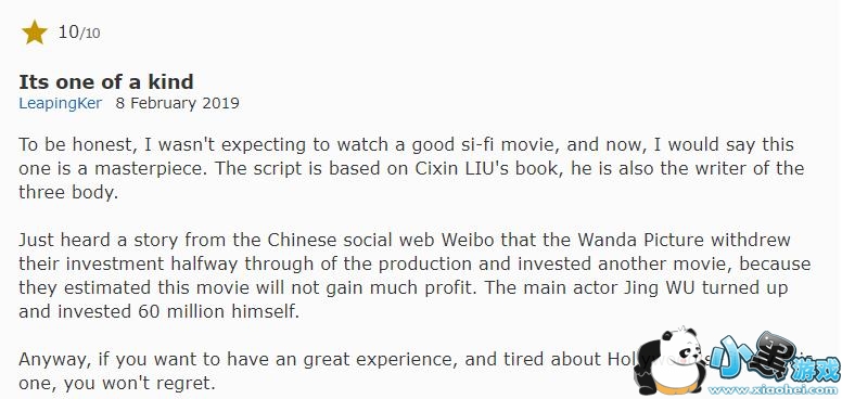 刚刚从中国社交网络微博上听到一个故事,万达在制作中途撤回了他们的投资并投入了另一部电影,因为他们估计这部电影不会获得多少利润。 主要演员吴京出现并自己投资了6000万。无论如何,如果你想拥有一个很棒的体验,并且对好莱坞的科幻感到厌倦,试试这个,你不会后悔的。