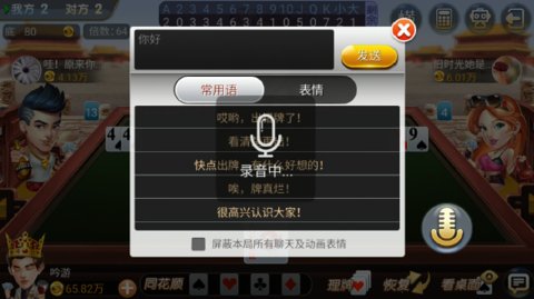 最后登场的是语音功能啦,在房间里,通过语音聊天的功能,就能够实时对讲了。一边玩游戏,一边聊天,不仅能够发语音聊天,而且游戏内自带的表情也很丰富。来掼蛋是不是很酷。