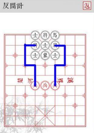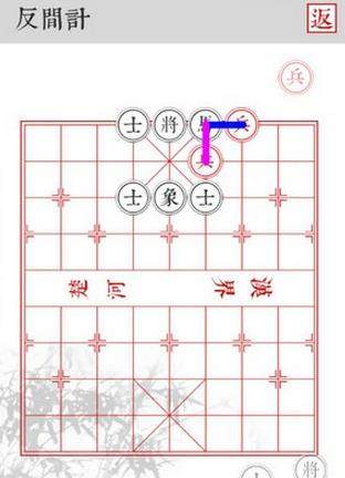 1.沿着蓝色线路拖动,三个兵分别放在中间三路,沿着紫色线路拖动,两个黑将放在九宫格里。