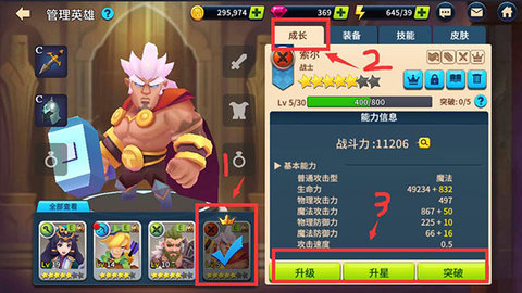 点击你想升级的英雄,然后选择成长,下边会出现升级、升星、突破三个按键。