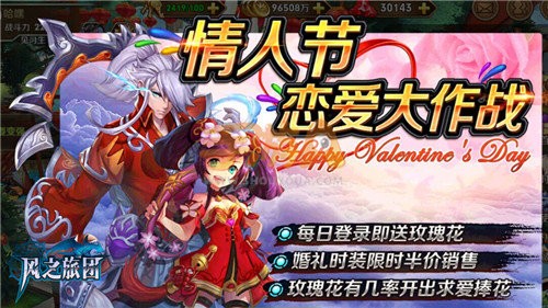 2019年情人节与春节近在咫尺,《风之旅团》今日起提前开启“情人节大作战”:每天登陆即送玫瑰花,收集玫瑰花有几率开出求爱捧花,更有婚礼时装限时半价销售,同时开启“天罚+血牙”的特殊抽奖。情人节大作战”之后春节活动将继续开启,完成活动即可获得红包,更有喜庆烟花武器等你带回家!