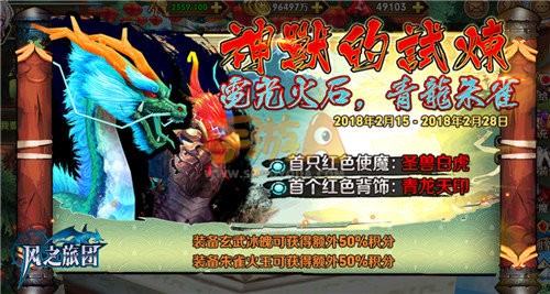 大事件“神兽的试炼”开启;红色使魔“圣兽白虎”、红色背饰“青龙天印”上线;武器“圣火”觉醒。情人节活动以及新春活动也同步开启!