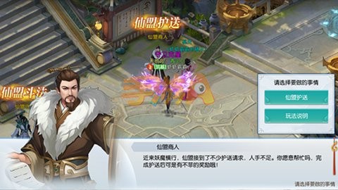 仙盟护送:帮助仙盟管家护送重要人物或者物资。小主护送时小心堤防在PVP场景中杀人劫宝的玩家哦,这可是关系到仙盟荣誉和贡献的活动。表现优秀的话,升官加职就指日可待了~