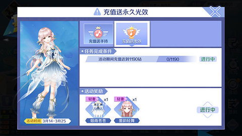 和上面的限时礼盒活动服饰一样,这个充值送永久光效活动,同样需要我们充值才可以获得。3月14日-3月25日期间,玩家累计充值一定的钻石,就可以领取这套极具中国风的服饰,其中包含了衣服烟雨苍苍、发型墨韵轻舞,另外还有非常稀少的手持。