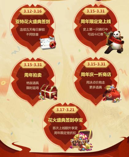 在本次周年庆中,丰厚的免费福利将让翘首以盼的玩家们激动不已。“亚特花火盛典签到”活动将为所有玩家贡献每日登陆豪礼,3月12日-3月16日期间登陆即可领取免费礼包,每天登陆惊喜福利各不相同,不但有海量金币、魔石免费送,也少不了超级经验值的奖励加持,助力神选者们等级、颜值全线升级!