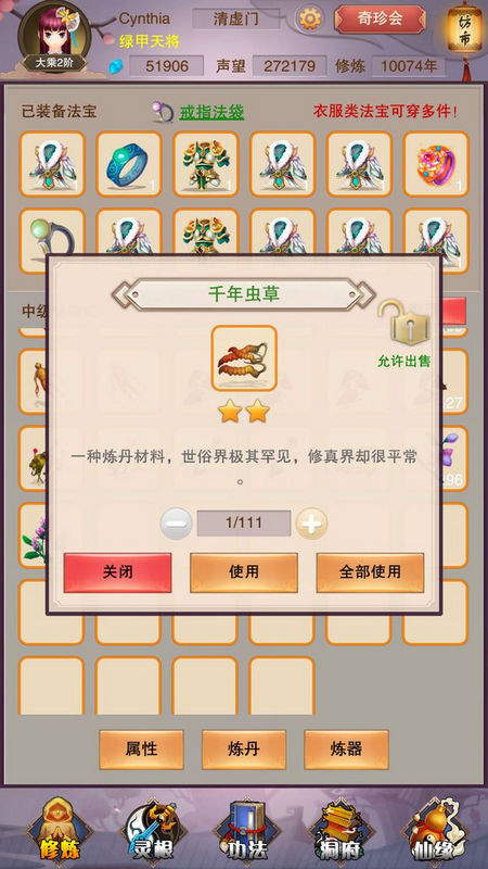 | 元婴丹 | 合体丹 | 金岭砂 | 千年人参 | 金元丹 |