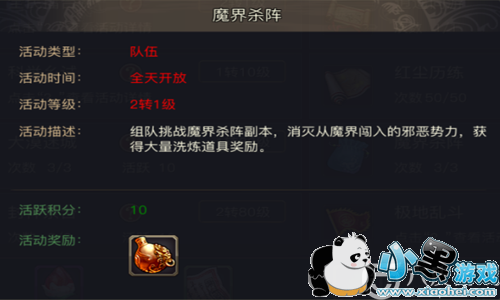 玩家通关这个副本的奖励有10个活跃积分以及洗练道具,洗练道具是用于装备洗练,在别的副本或者是活动中很少能看到,所以需要洗练装备的玩家就一定要来参与这个魔界杀阵活动。