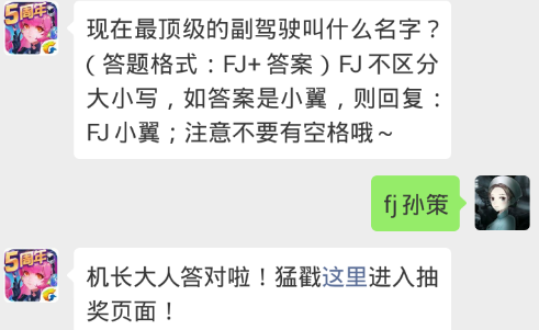 在全民飞机大战手游中,现在最顶级的副驾驶叫什么名字?(答题格式:FJ+答案)FJ不区分大小写。我们一起了解一下吧!