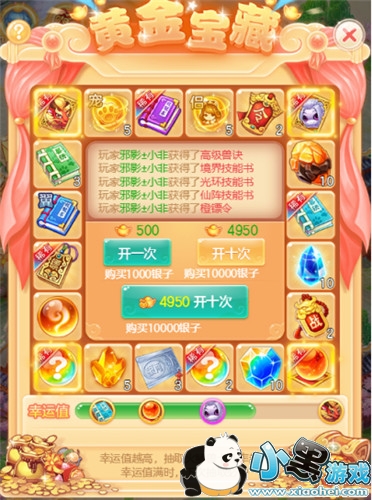 首先不能错过的是黄金宝藏,可以抽到紫色宠物鬼剑客和金色宠物火麒兽,每日都有一次免费抽取的机会,除此之外,还可以花费不绑定元宝和绑定元宝抽取。如果元宝不多的话,小黑游戏小编建议是使用绑定元宝比较划算,运气好的话,抽几次就能抽中紫色的宠物鬼剑客,如果欧气不足也不用担心,每抽一次就会加一点幸运值,待幸运值达到一定的要求,便可获得对应的物品奖励,当幸运条满的时候就会获得金色宠物火麒兽啦。如果元宝足够的情况下,小黑游戏小编建议第一次使用不绑定元宝十连抽,是必然会得到一张紫色宠物鬼剑客卡片的哦。