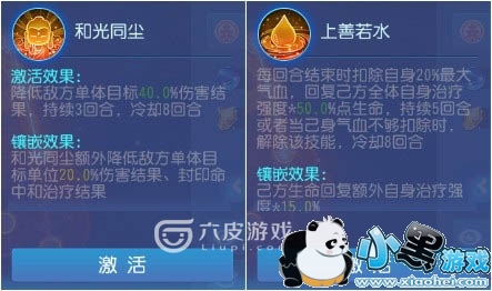 不息、上善若水——不息是增加自己的生存能力,大招上善若水是增加全体恢复。按照治疗强度700计算,在镶嵌的情况下每回合可以恢复500血左右,和魔王的守护差不多。但是每回合需要扣除20%气血,按照5500计算的话是1100,如果气血很低,很可能这个技能效果不能持续,还好有不息技能,气血低的情况每回合可以恢复550的血量,实际上只要回合结束时血量大于500,大招就可以持续释放了,条件也不算很苛刻,但是不如最开始的扣除10%要求低。