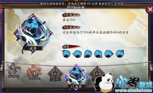 搭配点评:鬼女本身就有高额的伤害,搭配破势的御魂效果能够让鬼女对生命值高于70%的单位造成额外40%的伤害,进一步提高鬼女的输出能力,让鬼女打出高爆发的伤害。