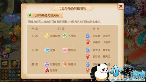 玩家可以只转换门派(限同种族),也可以只转换角色(限同种族、同性别),还可以同时转换门派和角色(限同性别,不限种族)。