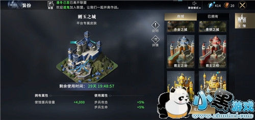 目前活动推出的皮肤不多,除了至高领主可以获取主堡皮肤瓦雷利亚之影兑换券(永久),贵15可以雄伟之城溪谷兑换券(永久)在外,还有QQ专属活动以及实力里程碑(限内测玩家)可以获得限时的主堡皮肤。详情见小黑游戏。