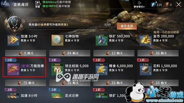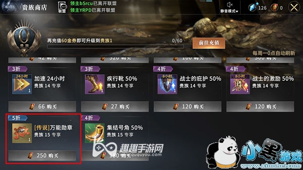 其中紫色万能勋章可以当成A级的领主碎片来进行使用,需要玩家达到贵族6才可以进行购买,5折的话75点卷就可以购买一个。