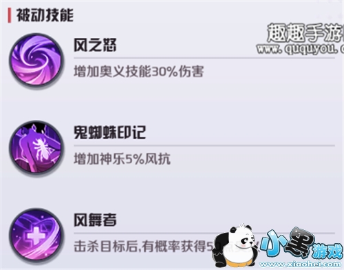 2、鬼蜘蛛印记:直接增加神乐5%的风属性抗性,相当于5%风属性攻击的伤害减免,提高生存能力。