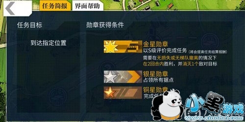 进入关卡地图后,点击左上方可以看到战场说明选项,再点击说明选项就可以看到三种勋章的获取条件。银星勋章获取条件:占据所有据点。
