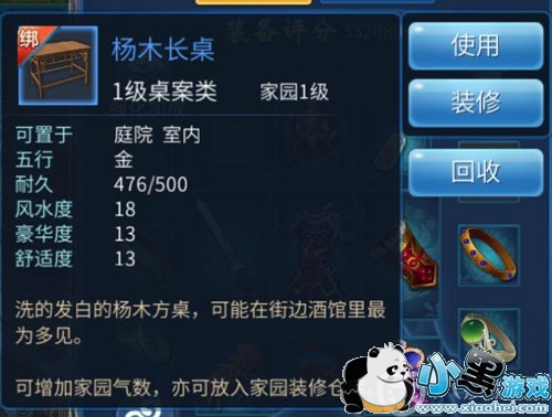 这里需要注意的是,点击家具有装修和使用两个选项,如果点击装修,那么就只能用来装修,不能当作气数材料。所以我们不能点装修,要点使用,然后在气数装饰那边点桌案类物品放入。