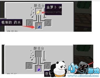 合成夜视药水:在酿造台上,先使用地狱疣和水瓶做一个粗糙药水,在用金胡萝卜和粗糙药水合成夜视药水。
