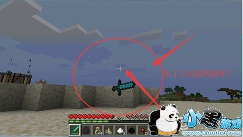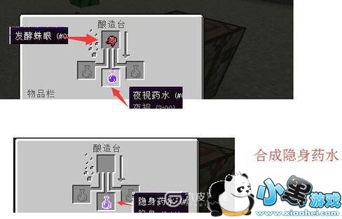 我们使用发酵的蜘蛛眼和夜视药水来合成隐身药水,可以参加下面图片合成,我们只要用隐身药水就可以隐身了。
