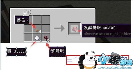 合成发酵蜘蛛眼:需要用工作台、糖、蜘蛛眼、蘑菇(灰色),随便放在工作台3*3格子中以后得到发酵的蜘蛛眼睛。